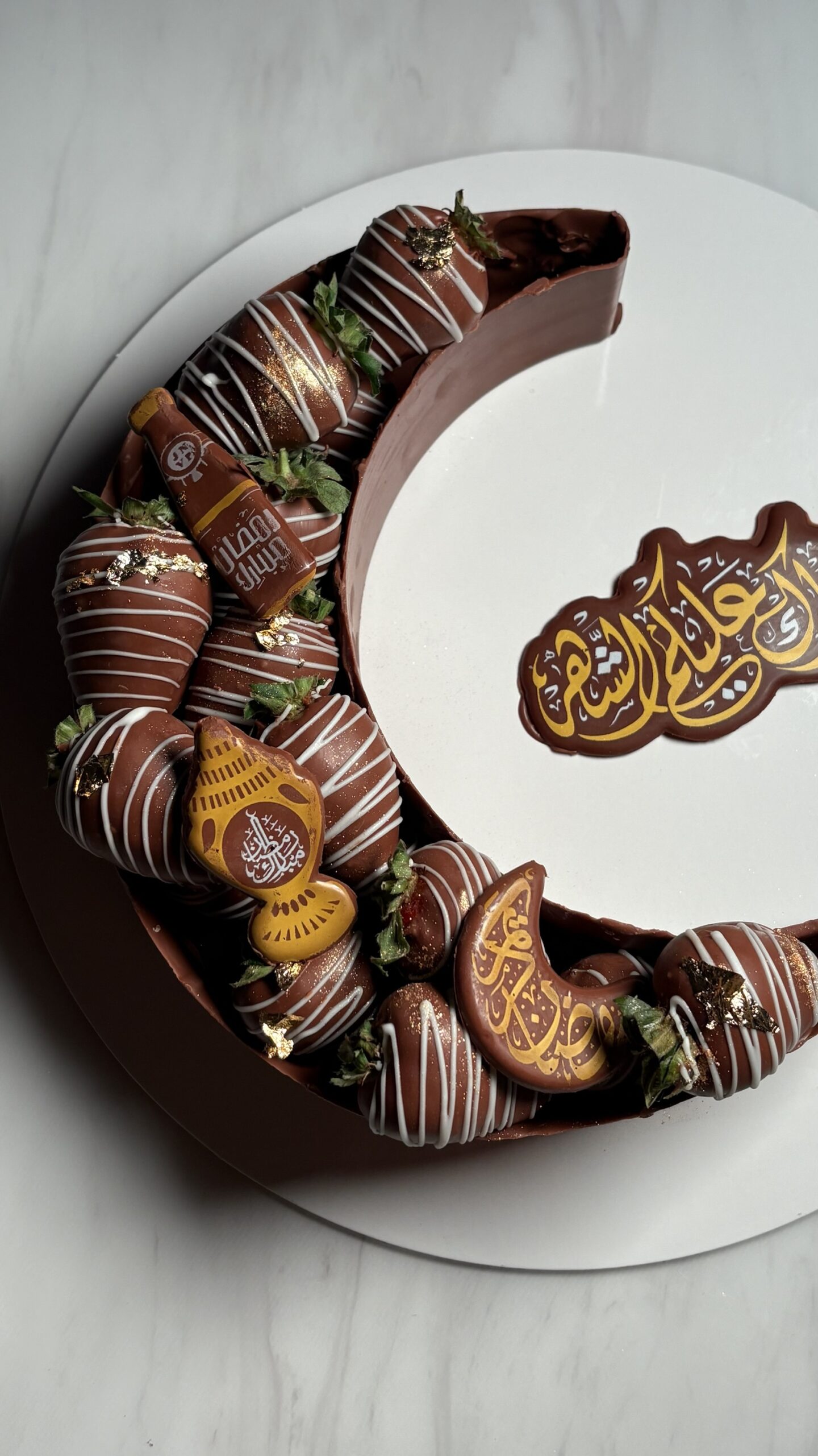 Indulge in a luxurious treat with our beautifully crafted moon-shaped chocolate, filled with 20 fresh, chocolate-dipped strawberries and elegantly decorated. Perfect for gifting and special Ramadan gatherings!