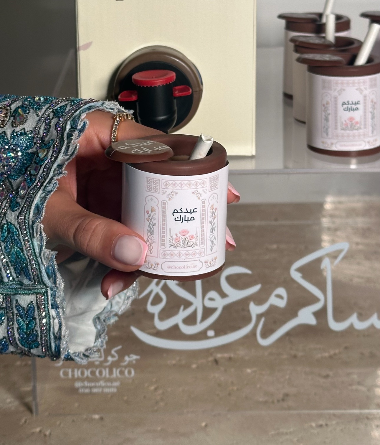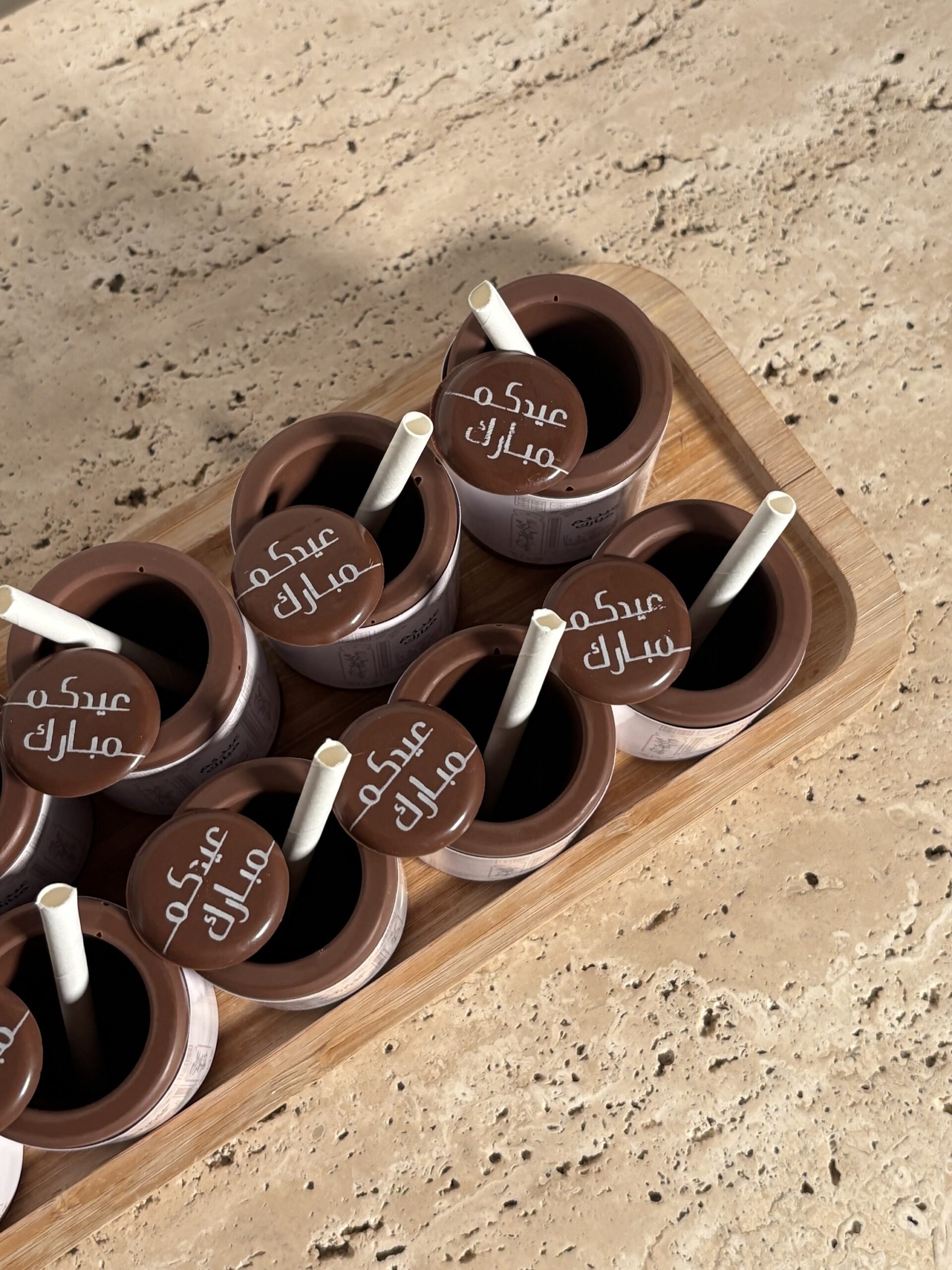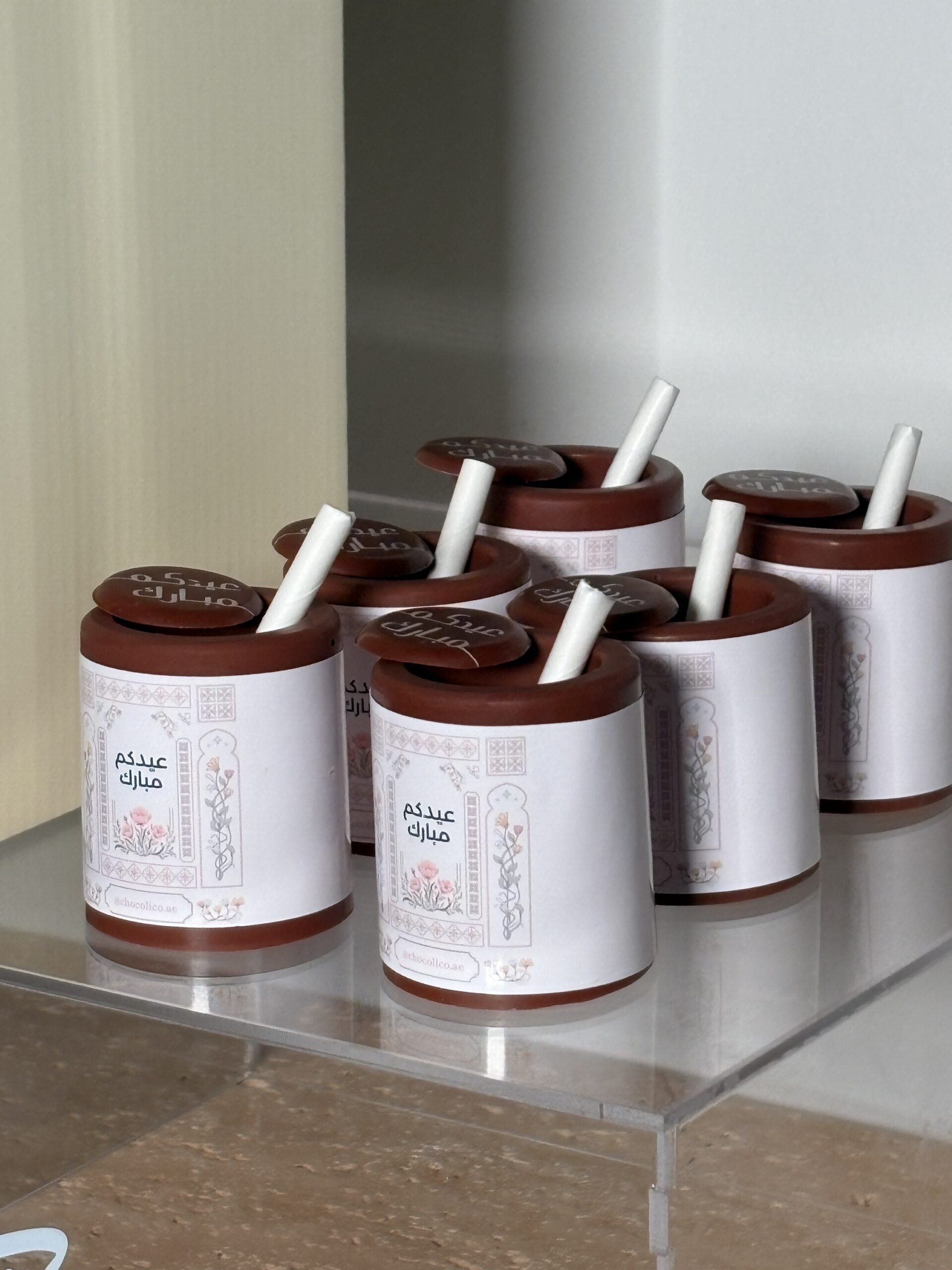 Set of 12 elegant chocolate cups, each with an edible topper and straw — perfect for serving iced coffee or matcha. Ideal for Eid gatherings and gifting.