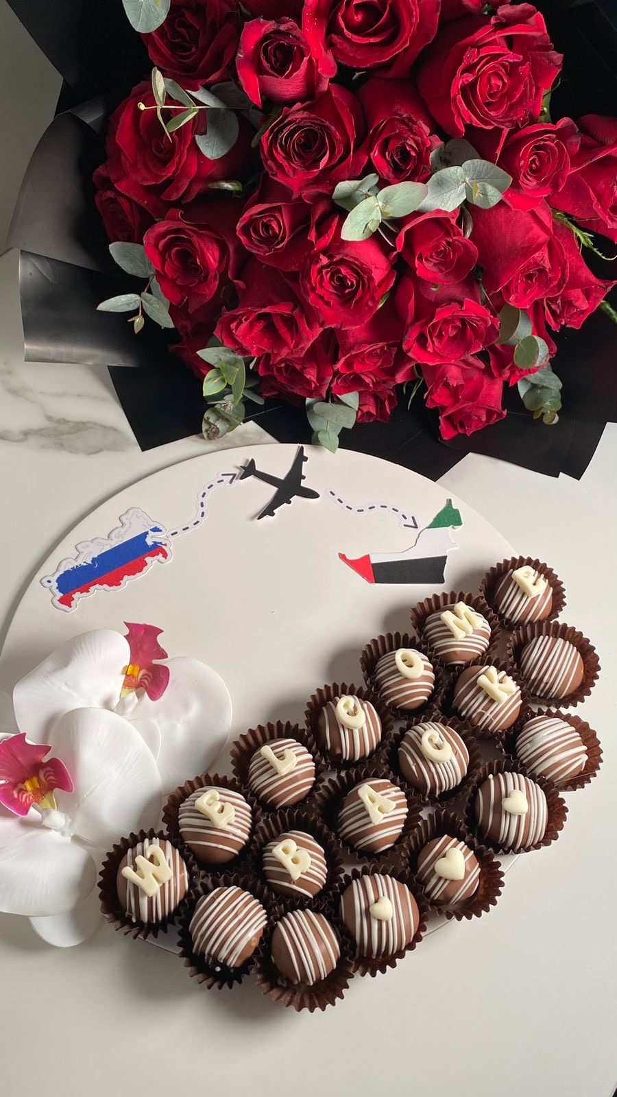 Elegant chocolate truffles with fresh roses — perfect for any special occasion.