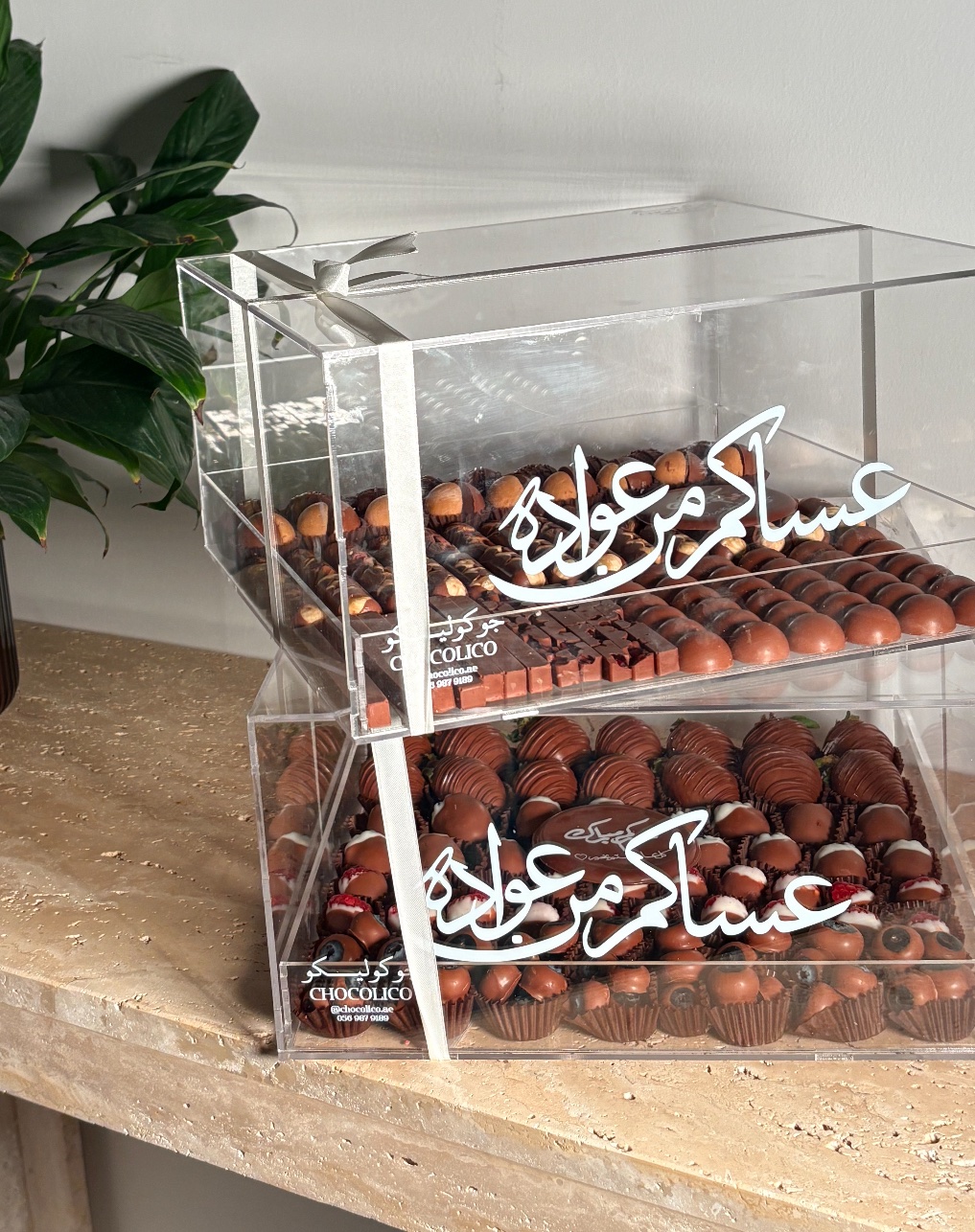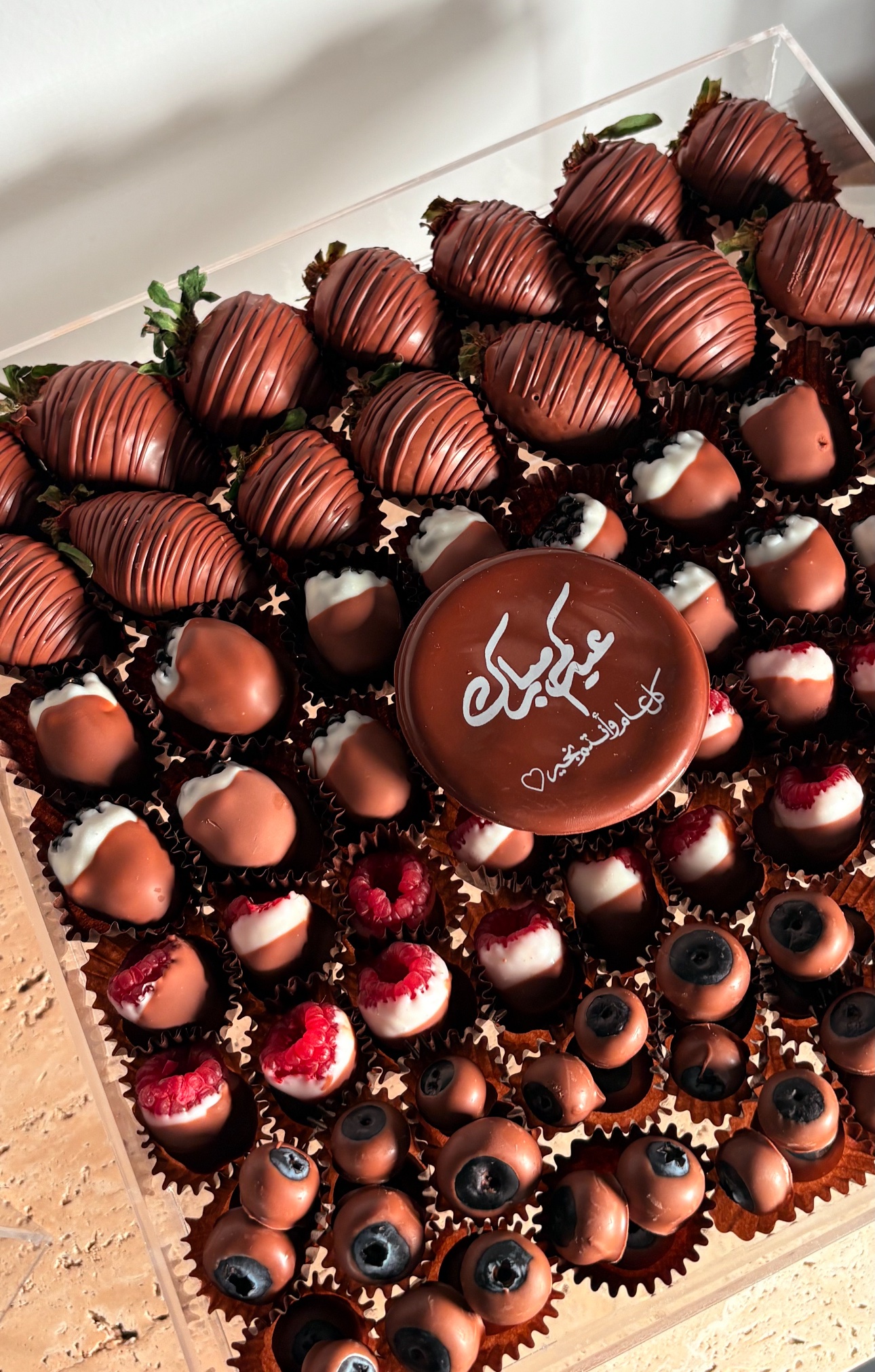 أكثر من ٥٠ حبة من الفواكه المشكلة ومغموسة بشوكولاتة بلجيكية فاخرة — تشمل الفراولة، التوت الأزرق، والتوت الأحمر والأسود.