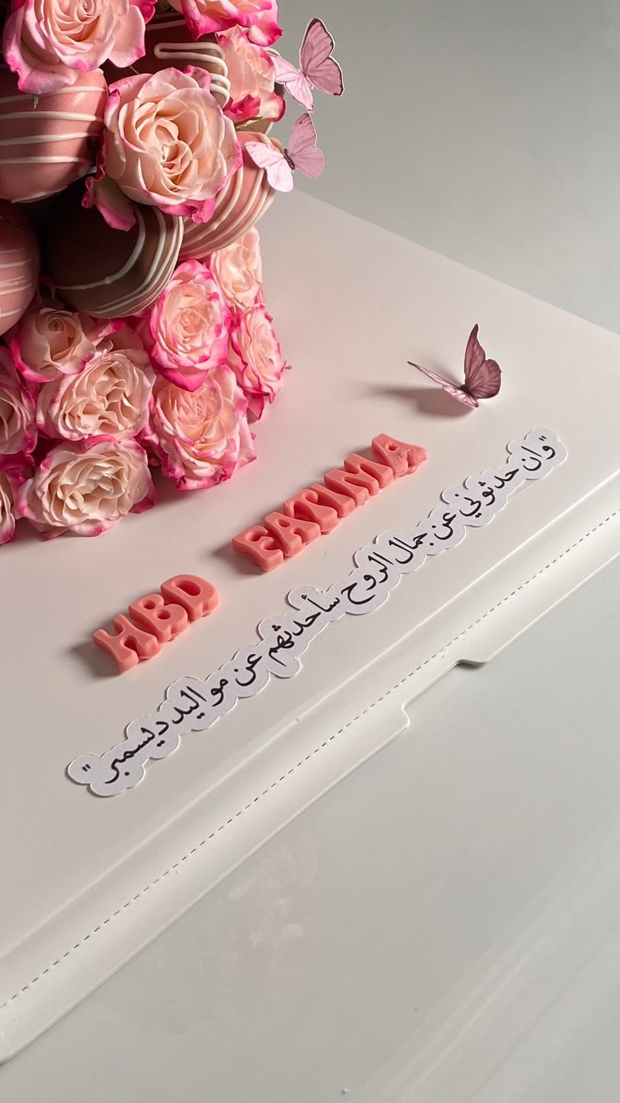 A stunning tower of fresh roses and chocolate-dipped strawberries, decorated with delicate butterflies. Colors and message can be customized to suit your occasion