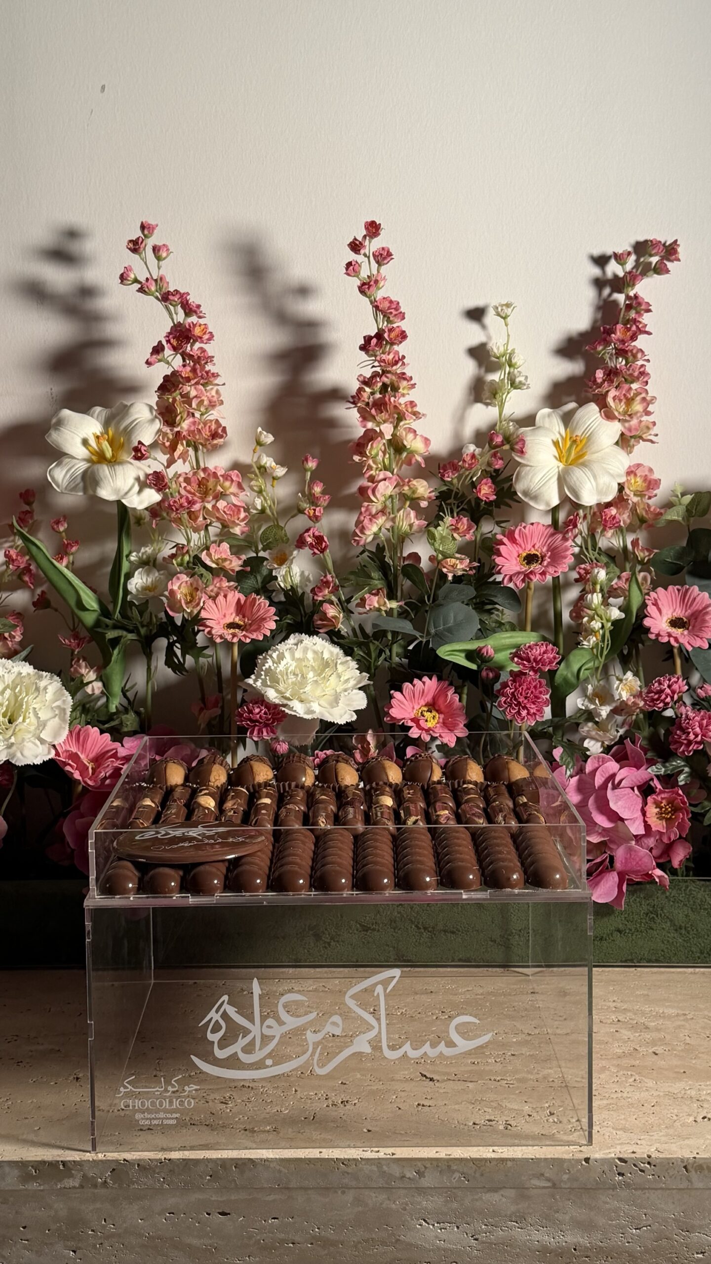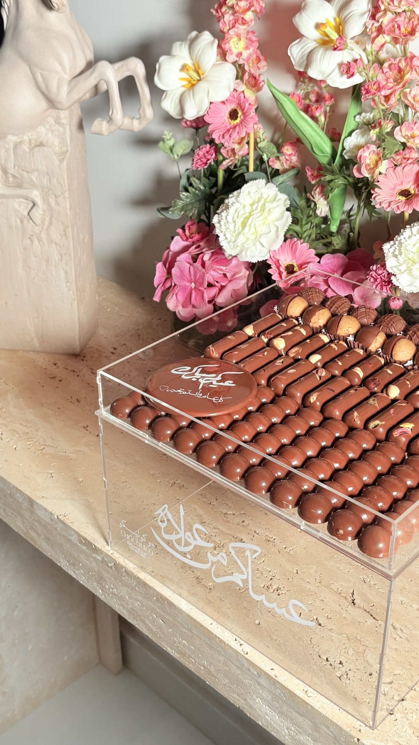 A premium acrylic box filled with assorted Belgian chocolates – includes Oreo truffles, hazelnut bars, pistachio pieces, chocolate-coated nuts, and signature chocolate Dubai filling. Perfect for Eid gifting or elegant occasions.